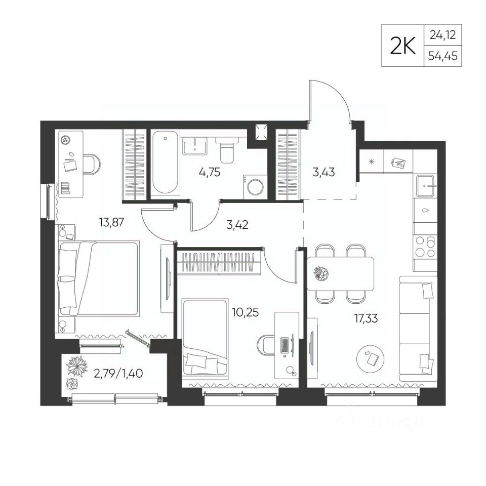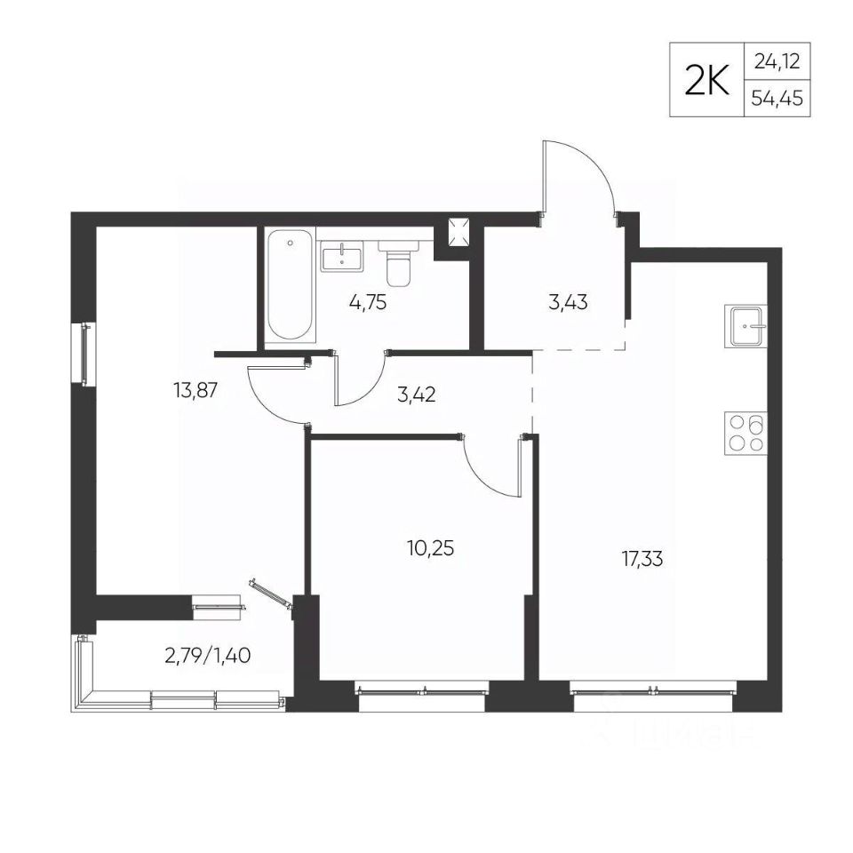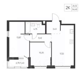 Общая площадь54,45 м²