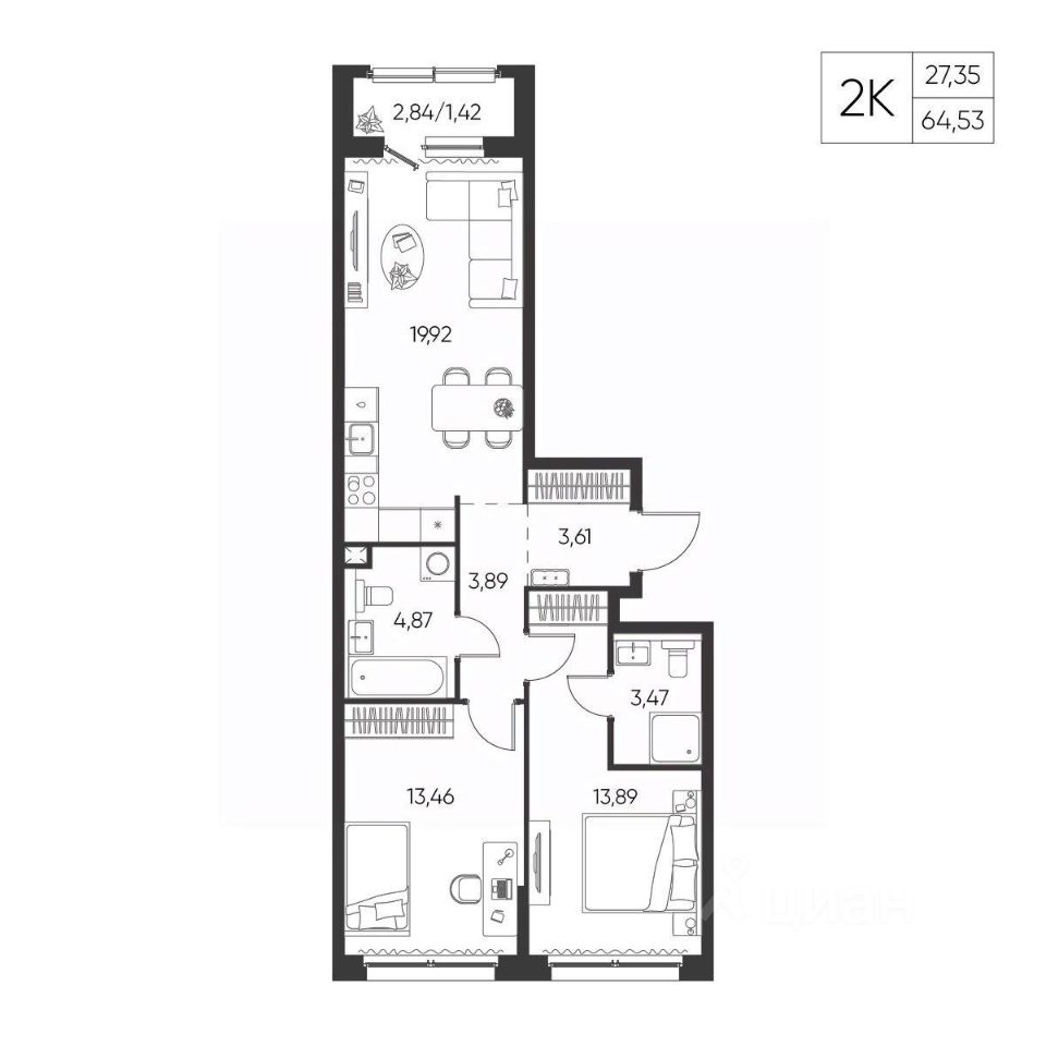 Общая площадь64,53 м²