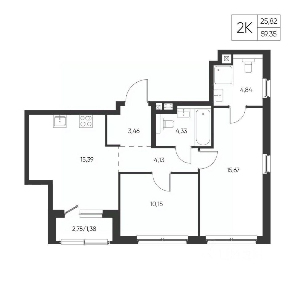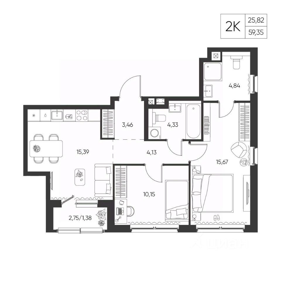 Общая площадь59,35 м²