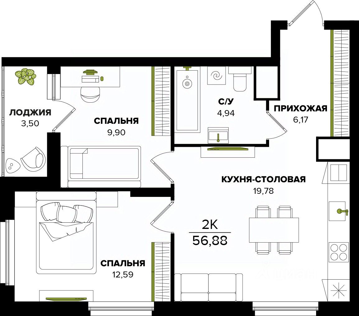 Общая площадь56,88 м²