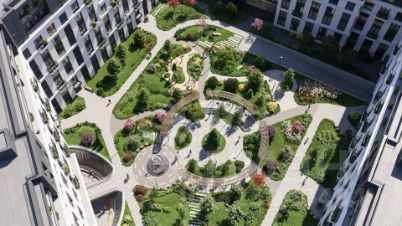 Переменная этажность от 3 до 10 этажей, закрытый внутренний двор с фонтанами, приватность без заборов и лишнего шума.