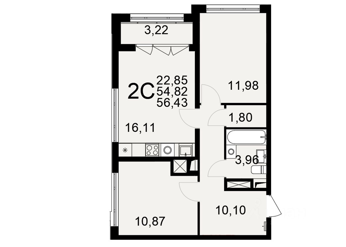 Продается 2-комн. квартира, 56,43 м²
