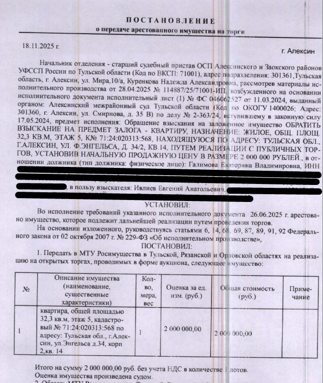 Помещение, назначение: жилое, наименование: квартира, кадастровый номер 71:24:020313:568, площадь 32,3 кв.м., местоположение: Тульская область, г.Алексин, ул.Энгельса, д.34 корп.2, кв.14. Сведениями о зарегистрированных по данному адресу лицах, а также о задолженности по взносам на капитальный ремонт Организатор торгов не располагает. Взыскатель, в пользу которого обращено взыскание Ивлиев Е.А. Согласно выписке ЕГРН от 19.12.2025 имеются сведения о залоге имущества в пользу КПК "Партнер Финанс". Реализация имущества должника не лишает права залогодержателя на обращение взыскания на предмет залога. Начальная цена: 2 000 000 (Два миллиона) руб. 00 коп., без НДС. Задаток: 90 000 (Девяносто тысяч) руб. 00 коп. Шаг аукциона 1%: 20 000 (Двадцать тысяч) руб. 00 коп.