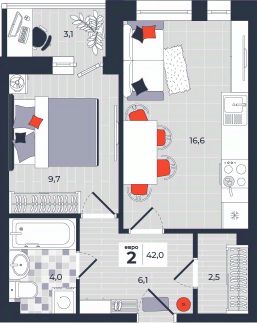 Продаётся 2-комнатная квартира в строящемся доме (Дом 30), срок сдачи: IV-кв. 2026, общей площадью 42 кв.м., на 6 этаже. Расположение, транспортная доступность Новый жилой комплекс "Юго-Восточный" строится в Туле, в 3,5 км от центра города. Благодаря удачным транспортным развязкам, автолюбители смогут доехать до центральных кварталов примерно за 5 10 минут, составив наиболее быстрый и удобный маршрут с учетом загруженности дорог. Проблем с мобильностью не возникнет и у пассажиров общественного транспорта. Рядом с домом расположены остановки автобусов и маршрутных такси, которые быстро довезут до любого района города. Так, чтобы добраться до центра, следует дойти пешком до остановки "Медтехника", где останавливается маршрутное такси, доезжающее до центральных кварталов всего за 7 8 минут. Инфраструктура Район, где возводится новый жилой комплекс, активно застраивается, и сеть инфраструктуры сов временем будет расширяться. Но и сейчас все, что нужно для комфортной жизни в городе, находится недалеко от жилого комплекса. В шаговой доступности расположены продуктовые магазины: "Виктория", "Овощи-фрукты", Магазин рыбы и мяса птицы, магазин мяса и колбас "У Максима", супермаркеты "Дикси", "Пятерочка", "SPAR". Неподалеку находится гипермаркет "Линия", крупный торговый центр, в котором расположены отделения банков, гипермаркет "Глобус", салон оптики, мебельный магазин "Столплит", зоомагазин "Четыре лапы" и пр. В соседнем здании находится строительный гипермаркет "Леруа Мерлен", за ним крупный магазин товаров для спорта, туризма и активного отдыха "Декатлон".Недалеко от жилого комплекса открыты кафе и рестораны: кофейня "Bonape", пиццерия "Культура", кафе "Вкуснов", кафе быстрого обслуживания "Rapido", ресторан "У фонтана" и пр.В районе есть аптеки, поликлиники, диагностические центры. В шаговой доступности от жилого комплекса расположено несколько детских садиков, в том числе, садик комбинированного вида "Алые паруса". Есть дошкольные отделения, входящие в состав образовательных центров, Центры развития ребенка. Поблизости расположены средние школы, в том числе, школа для детей с ОВЗ. Рядом с жилым комплексом находится Тульская Духовная Семинария и Суворовское училище. Надежность застройщик: достраивает объект ООО Ин-Групп.АрхитектураЖилой комплекс будет представлен 19 монолитно-кирпичными корпусами переменной этажности, выполненными в едином архитектурном стиле. При строительстве ЖК "Юго-Восточный" применяются современные материалы высокого качества, которые обеспечивают надежность домов и комфортный микроклимат в помещениях. Каждая секция оснащается современными лифтами. Помещения общего пользования отделываются экологичными материалами. Квартиры предлагаются однокомнатные (от 43,9 кв. м), двухкомнатные (от 45,8 кв. м), трехкомнатные (от 60,4 кв. м) и четырехкомнатные (от 87,2 кв. м), а также уютные студии (от 28,9 кв. м).На внутренней территории проводится комплексное благоустройство: озеленение, организация игровых площадок, мест для отдыха и занят
