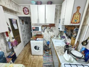 Далее кухня, стандартные 5.5 кв.м., горячая вода из колонки, установлена стиральная машинка, холодильник вынесен в коридор.