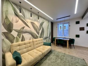 В квартире есть балкон, где можно наслаждаться свежим воздухом. Просторная гостиная с ярким декором создает атмосферу уюта и комфорта. В спальне стильное оформление стен и удобная мебель.