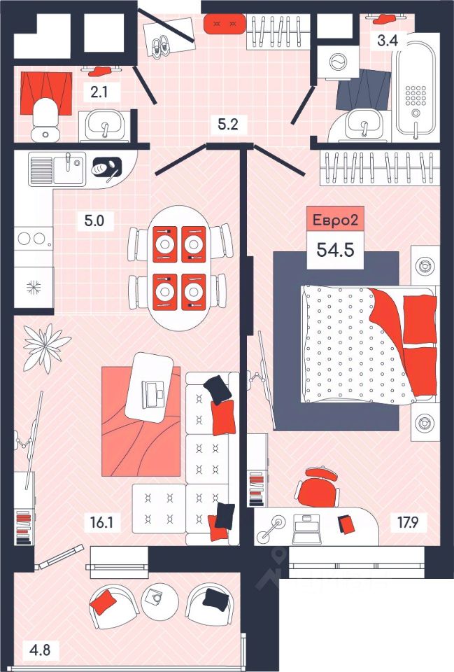 Продаётся 2-комнатная квартира в строящемся доме (Дом 20), срок сдачи: I-кв. 2026, общей площадью 54.5 кв.м., на 13 этаже. Расположение, транспортная доступность Новый жилой комплекс "Юго-Восточный" строится в Туле, в 3,5 км от центра города. Благодаря удачным транспортным развязкам, автолюбители смогут доехать до центральных кварталов примерно за 5 10 минут, составив наиболее быстрый и удобный маршрут с учетом загруженности дорог. Проблем с мобильностью не возникнет и у пассажиров общественного транспорта. Рядом с домом расположены остановки автобусов и маршрутных такси, которые быстро довезут до любого района города. Так, чтобы добраться до центра, следует дойти пешком до остановки "Медтехника", где останавливается маршрутное такси, доезжающее до центральных кварталов всего за 7 8 минут. Инфраструктура Район, где возводится новый жилой комплекс, активно застраивается, и сеть инфраструктуры сов временем будет расширяться. Но и сейчас все, что нужно для комфортной жизни в городе, находится недалеко от жилого комплекса. В шаговой доступности расположены продуктовые магазины: "Виктория", "Овощи-фрукты", Магазин рыбы и мяса птицы, магазин мяса и колбас "У Максима", супермаркеты "Дикси", "Пятерочка", "SPAR". Неподалеку находится гипермаркет "Линия", крупный торговый центр, в котором расположены отделения банков, гипермаркет "Глобус", салон оптики, мебельный магазин "Столплит", зоомагазин "Четыре лапы" и пр. В соседнем здании находится строительный гипермаркет "Леруа Мерлен", за ним крупный магазин товаров для спорта, туризма и активного отдыха "Декатлон".Недалеко от жилого комплекса открыты кафе и рестораны: кофейня "Bonape", пиццерия "Культура", кафе "Вкуснов", кафе быстрого обслуживания "Rapido", ресторан "У фонтана" и пр.В районе есть аптеки, поликлиники, диагностические центры. В шаговой доступности от жилого комплекса расположено несколько детских садиков, в том числе, садик комбинированного вида "Алые паруса". Есть дошкольные отделения, входящие в состав образовательных центров, Центры развития ребенка. Поблизости расположены средние школы, в том числе, школа для детей с ОВЗ. Рядом с жилым комплексом находится Тульская Духовная Семинария и Суворовское училище. Надежность застройщик: достраивает объект ООО Ин-Групп.АрхитектураЖилой комплекс будет представлен 19 монолитно-кирпичными корпусами переменной этажности, выполненными в едином архитектурном стиле. При строительстве ЖК "Юго-Восточный" применяются современные материалы высокого качества, которые обеспечивают надежность домов и комфортный микроклимат в помещениях. Каждая секция оснащается современными лифтами. Помещения общего пользования отделываются экологичными материалами. Квартиры предлагаются однокомнатные (от 43,9 кв. м), двухкомнатные (от 45,8 кв. м), трехкомнатные (от 60,4 кв. м) и четырехкомнатные (от 87,2 кв. м), а также уютные студии (от 28,9 кв. м).На внутренней территории проводится комплексное благоустройство: озеленение, организация игровых площадок, мест для отдыха и зан