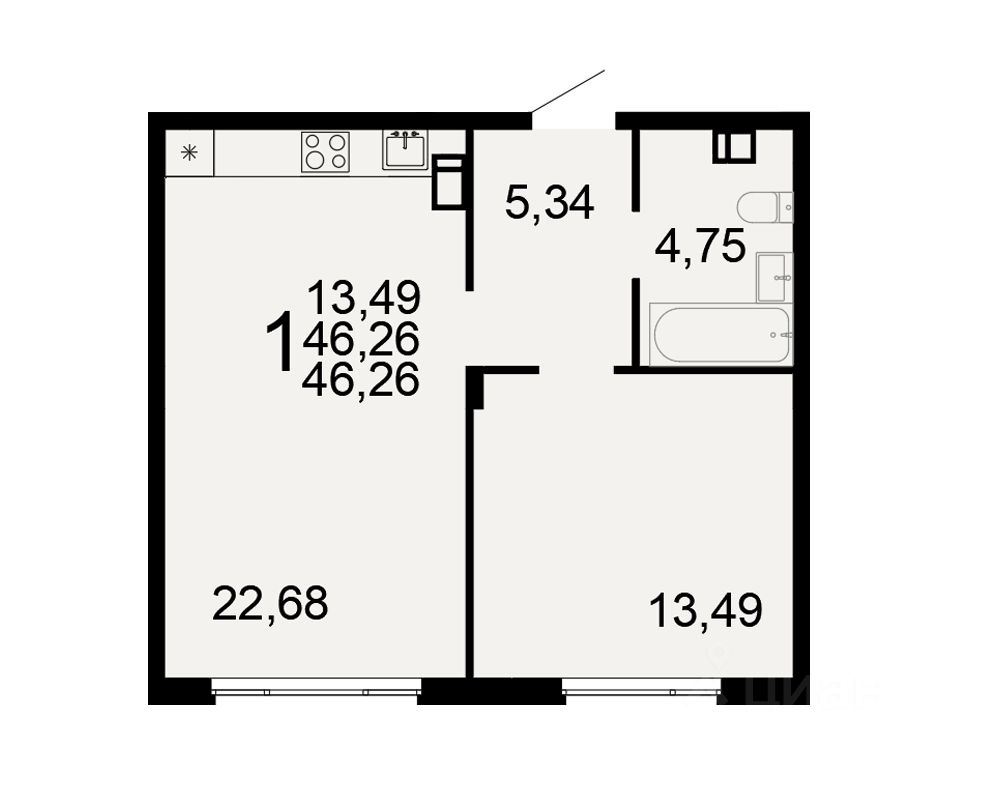 Продаётся 1-комнатная квартира в строящемся доме (поз.3), срок сдачи: IV-кв. 2027, общей площадью 46.26 кв.м., на 1 этаже.