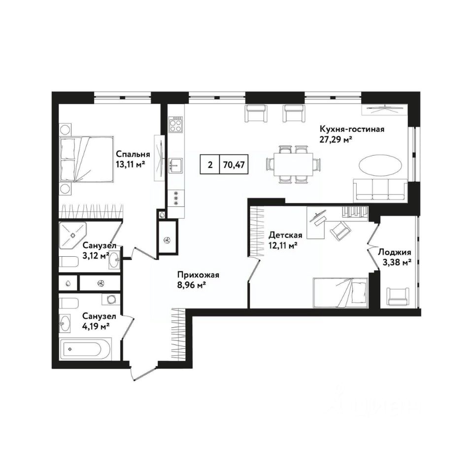 Квартира имеет большую кухню-гостиную, мастер спальню, детскую и два санузла. Большие окна по всему периметру квартиры гарантируют превосходное естественное освещение в течение всего дня. Квартира с качественной предчистовой отделкой, что позволяет новому владельцу сразу приступить к финишным работам по своему вкусу.