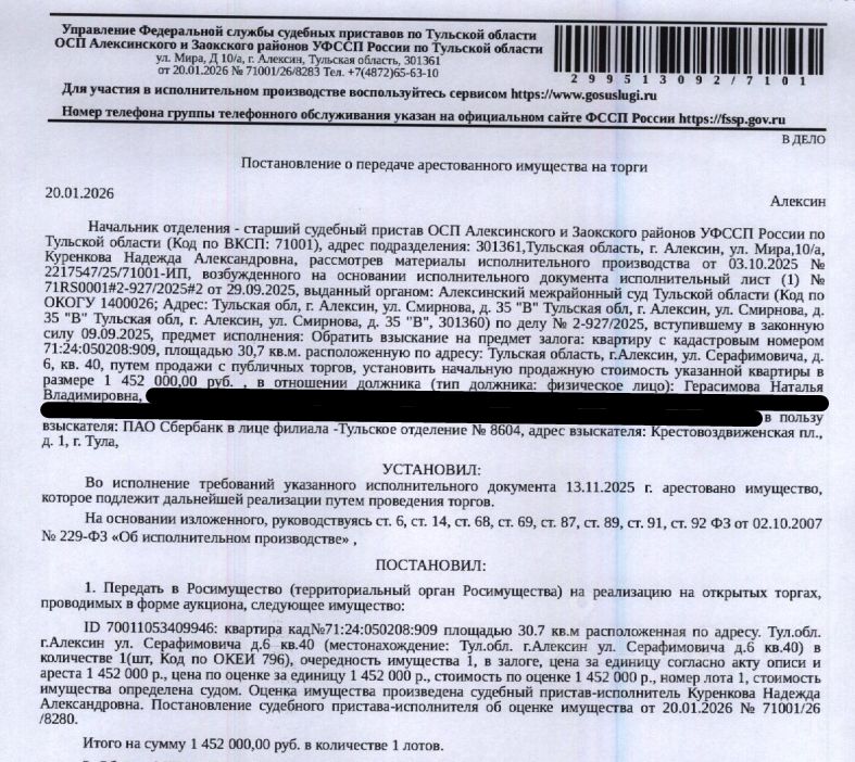 Помещение, назначение: жилое, наименование: квартира, кадастровый номер 71:24:050208:909, площадь 30,7 кв.м., местоположение: Тульская область, р-н Алексинский, г Алексин, ул Серафимовича, д 6, кв. 40. Сведениями о зарегистрированных по данному адресу лицах, а также о задолженности по взносам на капитальный ремонт Организатор торгов не располагает. Залогодержатель: ПАО "Сбербанк России". Начальная цена: 1 452 000 (Один миллион четыреста пятьдесят две тысячи) руб. 00 коп., без НДС. Задаток: 70 000 (Семьдесят тысяч) руб. 00 коп. Шаг аукциона 1%: 14 520 (Четырнадцать тысяч пятьсот двадцать) руб. 00 коп.
