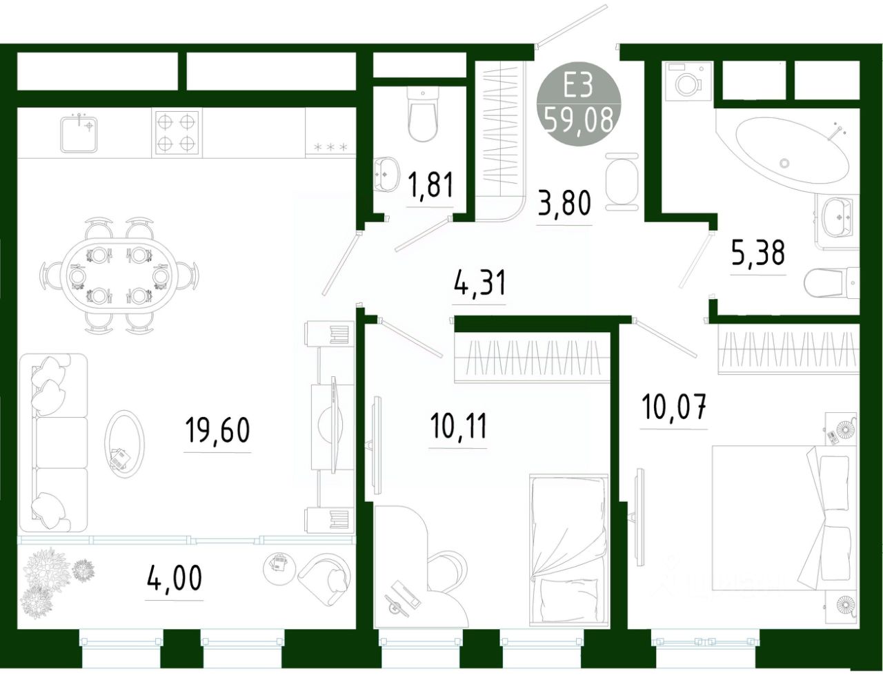Продаётся 2-комнатная квартира в строящемся доме (Позиция 2), срок сдачи: III-кв. 2029, общей площадью 59.08 кв.м., на 2 этаже. Новый жилой комплекс в г. Тула "Платон Парк" от застройщика ООО "СЗ "МОНОЛИТ""