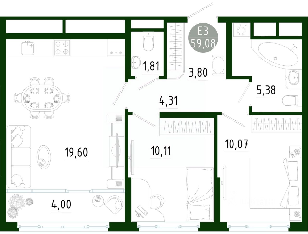 59,08 м²