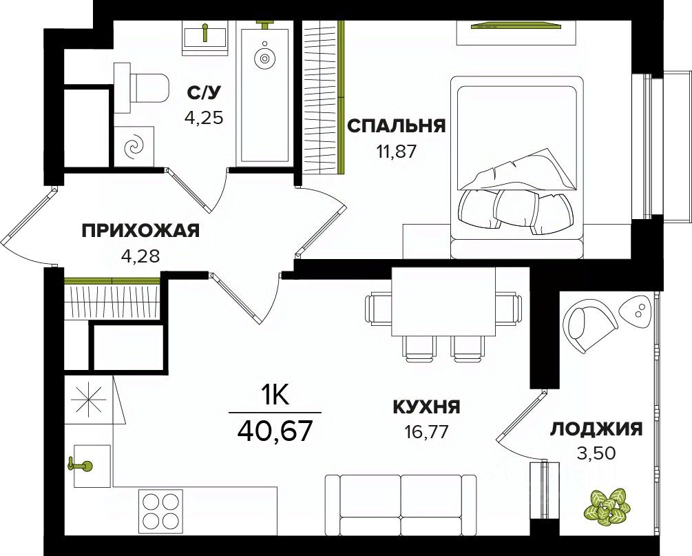 Общая площадь40,67 м²