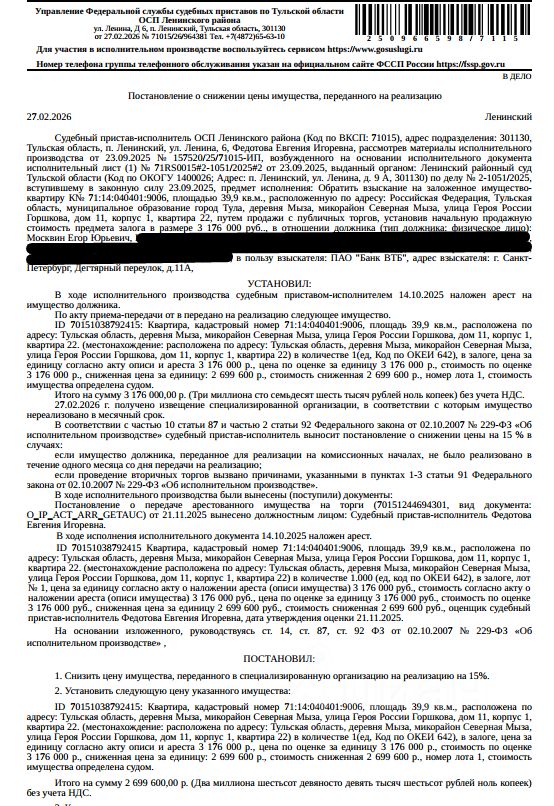 Помещение, назначение: жилое, наименование: квартира, кадастровый номер 71:14:040401:9006, площадь 39,9 кв.м., адрес: Российская Федерация, Тульская область, муниципальное образование город Тула, деревня Мыза, мкр. Северная Мыза, улица Героя России Горшкова, дом 11, корпус 1, квартира 22. Согласно справке ООО "УК Северная Мыза" от 14.10.2025 по данному адресу зарегистрировано 2 человека. Сведениями о задолженности по взносам на капитальный ремонт Организатор торгов не располагает. Залогодержатель: Банк ВТБ (ПАО). Начальная цена: 2 699 600 (Два миллиона шестьсот девяносто девять тысяч шестьсот) руб. 00 коп., без НДС. Задаток: 130 000 (Сто тридцать тысяч) руб. 00 коп. Шаг аукциона 1%: 26 996 (Двадцать шесть тысяч девятьсот девяносто шесть) руб. 00 коп.