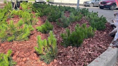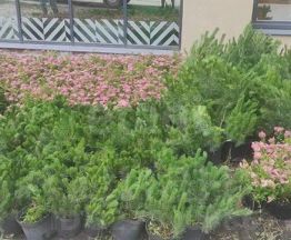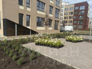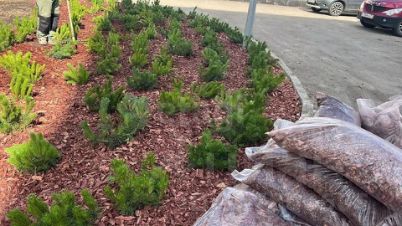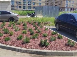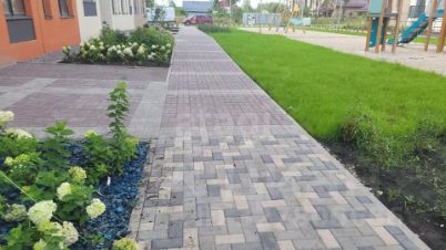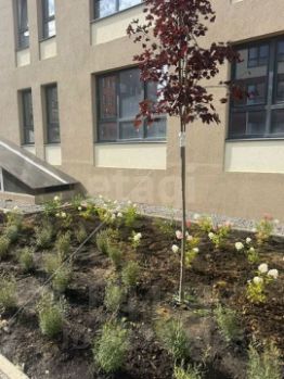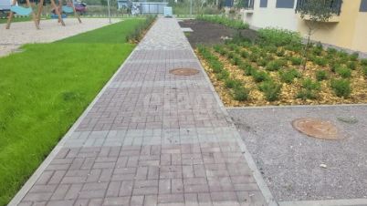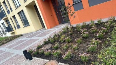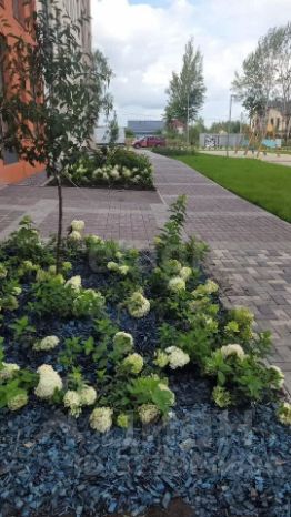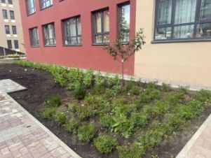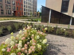 Благоустроенный ландшафт с взрослыми деревьями и цветниками