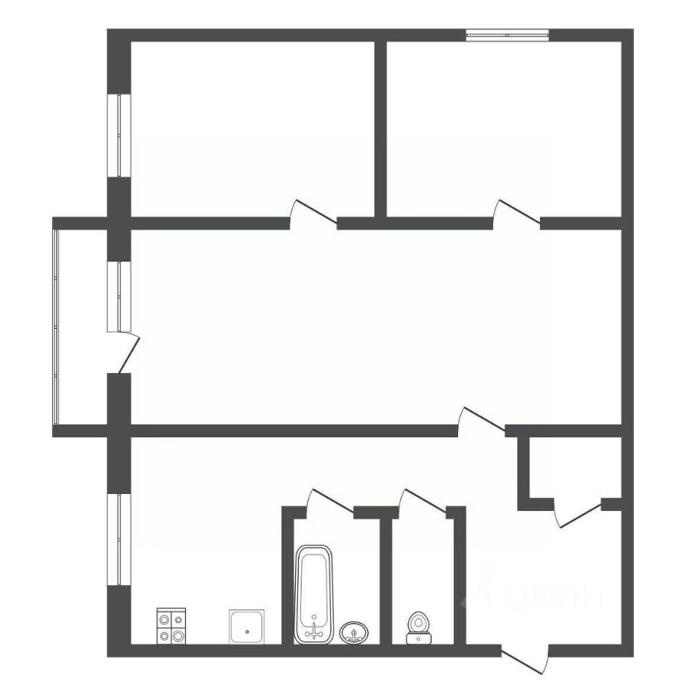 Планировка включает две изолированные светлые комнаты и проходной зал, что оптимально для семьи из трех-пяти человек и дает гибкость в расстановке мебели. Санузел раздельный.