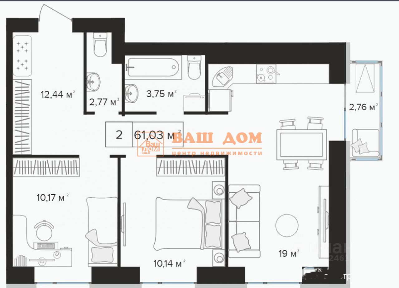 Удобная планировка с двумя санузлами, большой прихожей и выходом на балкон из кухни-гостиной.