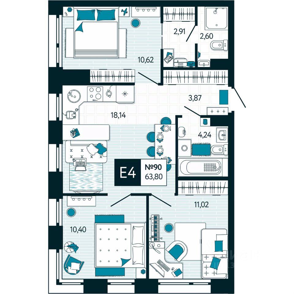 Общая площадь63,8 м²