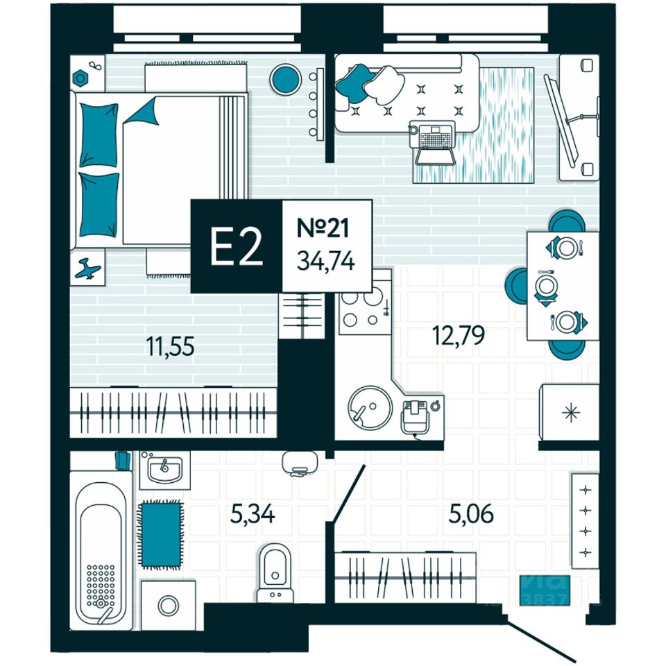 Общая площадь34,74 м²