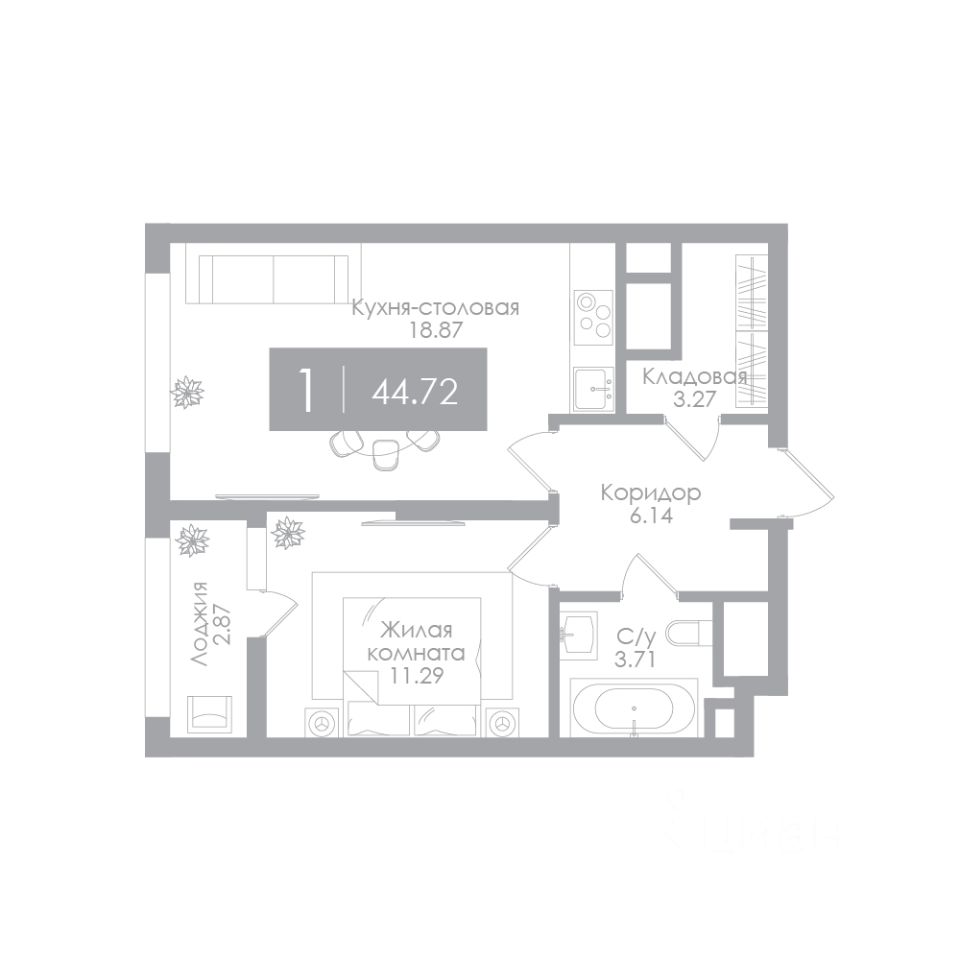 Продается 1-комн. квартира, 44,72 м²