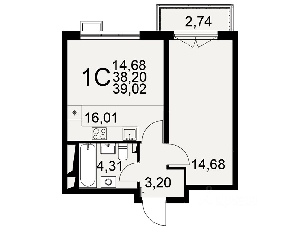 Общая площадь39,02 м²