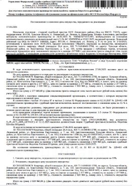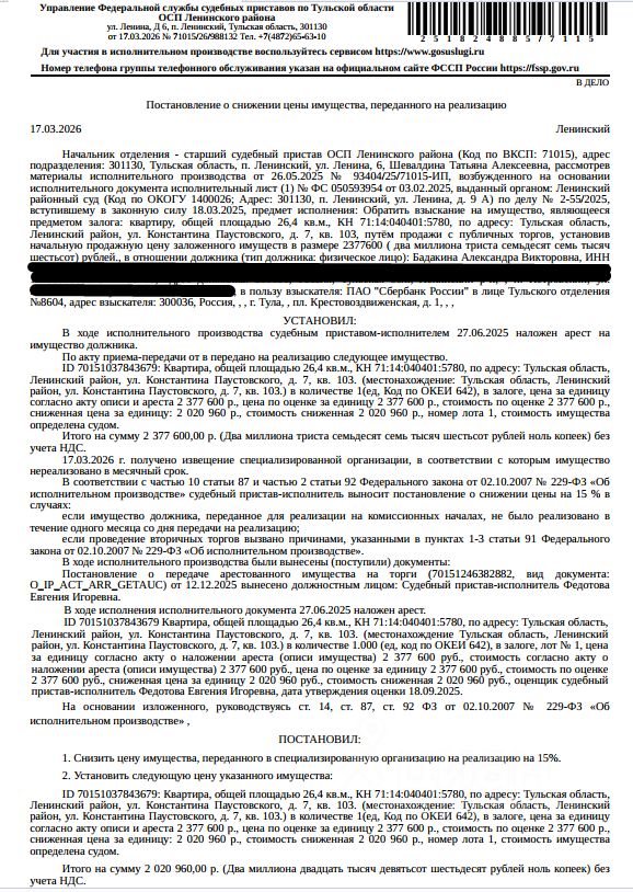 Помещение, назначение: жилое, наименование: квартира, кадастровый номер 71:14:040401:5780, площадь 26,4 кв.м., местоположение: Российская Федерация, Тульская область, Ленинский район, поселок Петровский, улица Константина Паустовского, дом 7, квартира 103. Сведениями о зарегистрированных по данному адресу лицах, а также о задолженности по взносам на капитальный ремонт Организатор торгов не располагает. Залогодержатель: ПАО "Сбербанк России". Начальная цена: 2 020 960 (Два миллиона двадцать тысяч девятьсот шестьдесят) руб. 00 коп., без НДС. Задаток: 100 000 (Сто тысяч) руб. 00 коп. Шаг аукциона 1%: 20 209 (Двадцать тысяч двести девять) руб. 60 коп.