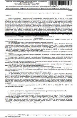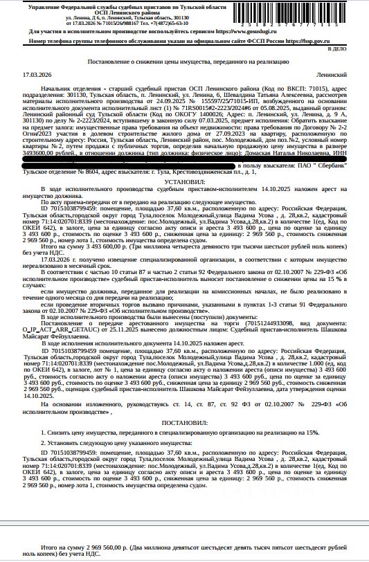 Помещение, назначение: жилое, наименование: квартира, кадастровый номер 71:14:020701:8339, площадь 37,6 кв.м., местоположение: Российская Федерация, Тульская область, городской округ город Тула, поселок Молодежный, улица Вадима Усова, дом 28, квартира 2. Сведениями о зарегистрированных по данному адресу лицах, а также о задолженности по взносам на капитальный ремонт Организатор торгов не располагает. Залогодержатель: ПАО "Сбербанк России". Начальная цена: 2 969 560 (Два миллиона девятьсот шестьдесят девять тысяч пятьсот шестьдесят) руб. 00 коп., без НДС. Задаток: 140 000 (Сто сорок тысяч) руб. 00 коп. Шаг аукциона 1%: 29 695 (Двадцать девять тысяч шестьсот девяносто пять) руб. 60 коп.