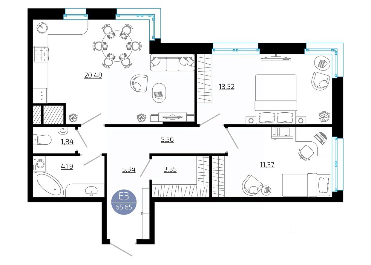 Общая площадь65,65 м²
