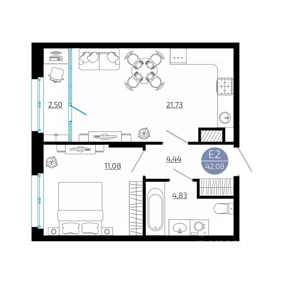 Общая площадь42,08 м²