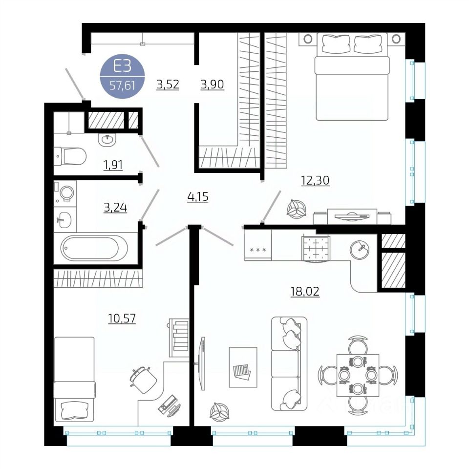 Общая площадь57,61 м²