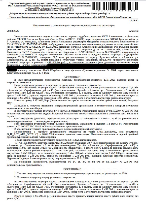 Помещение, назначение: жилое, наименование: квартира, кадастровый номер 71:24:050208:909, площадь 30,7 кв.м., местоположение: Тульская область, р-н Алексинский, г Алексин, ул Серафимовича, д 6, кв. 40. Сведениями о зарегистрированных по данному адресу лицах, а также о задолженности по взносам на капитальный ремонт Организатор торгов не располагает. Залогодержатель: ПАО "Сбербанк России". Начальная цена: 1 234 200 (Один миллион двести тридцать четыре тысячи двести) руб. 00 коп., без НДС. Задаток: 60 000 (Шестьдесят тысяч) руб. 00 коп. Шаг аукциона 1%: 12 342 (Двенадцать тысяч триста сорок два) руб. 00 коп.