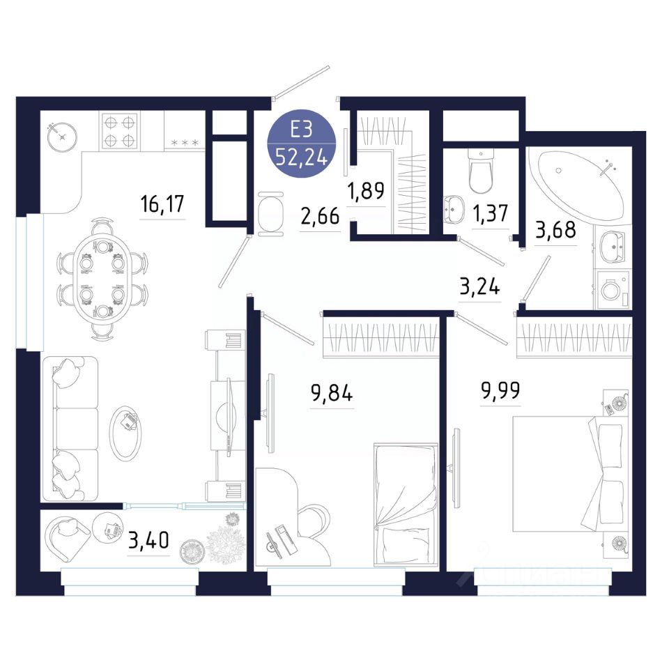Общая площадь52,24 м²