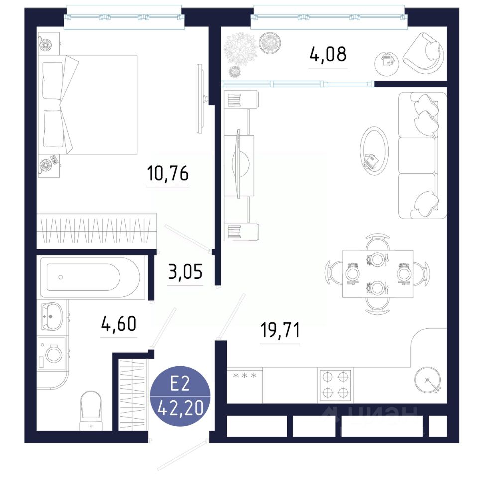 Общая площадь42,2 м²