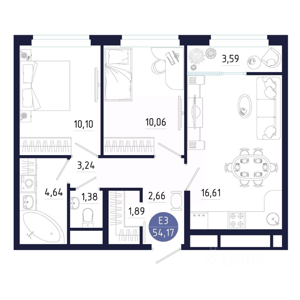 Общая площадь54,17 м²