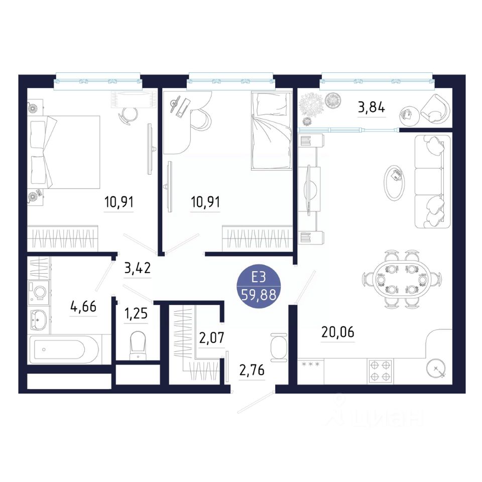 Общая площадь59,88 м²