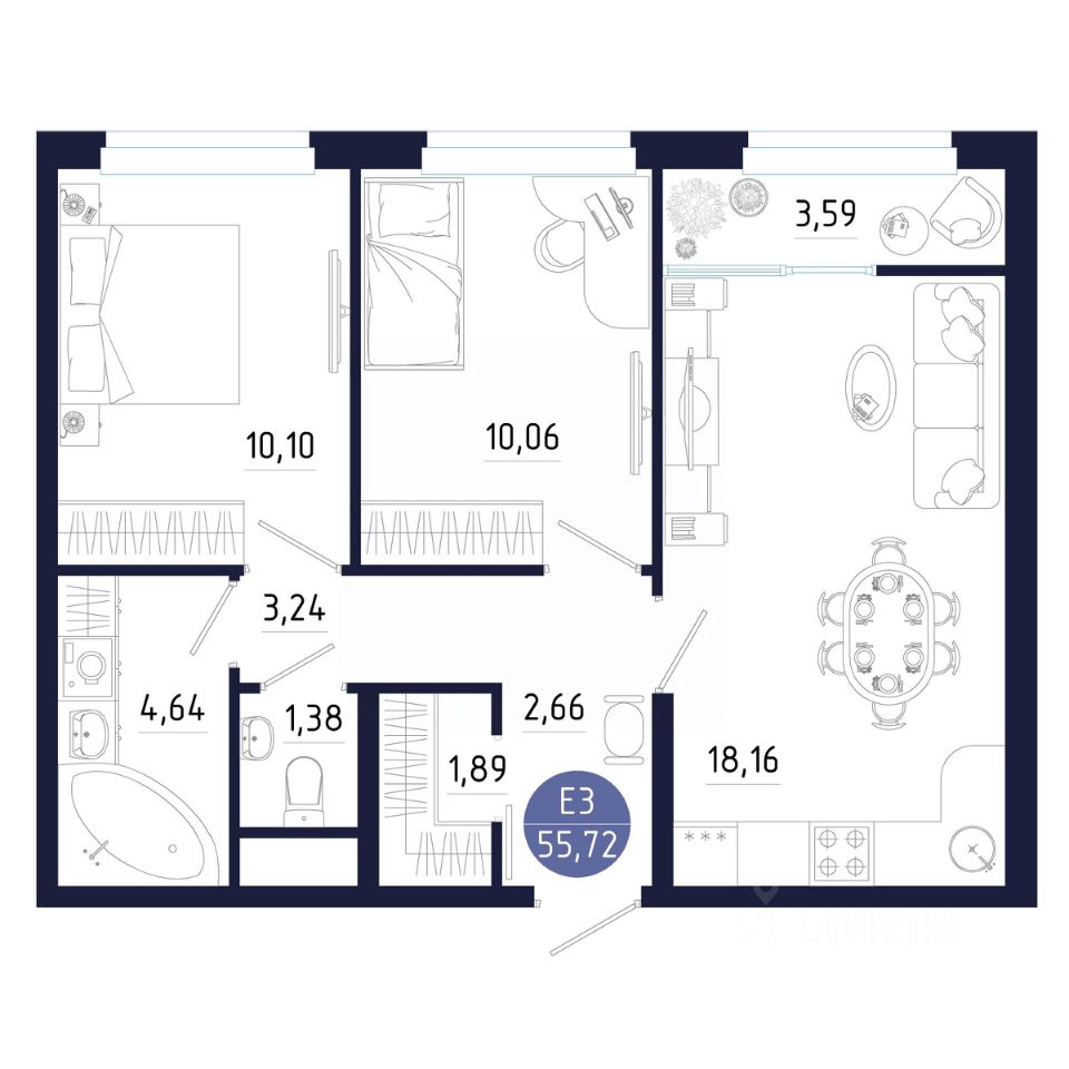 Общая площадь55,72 м²