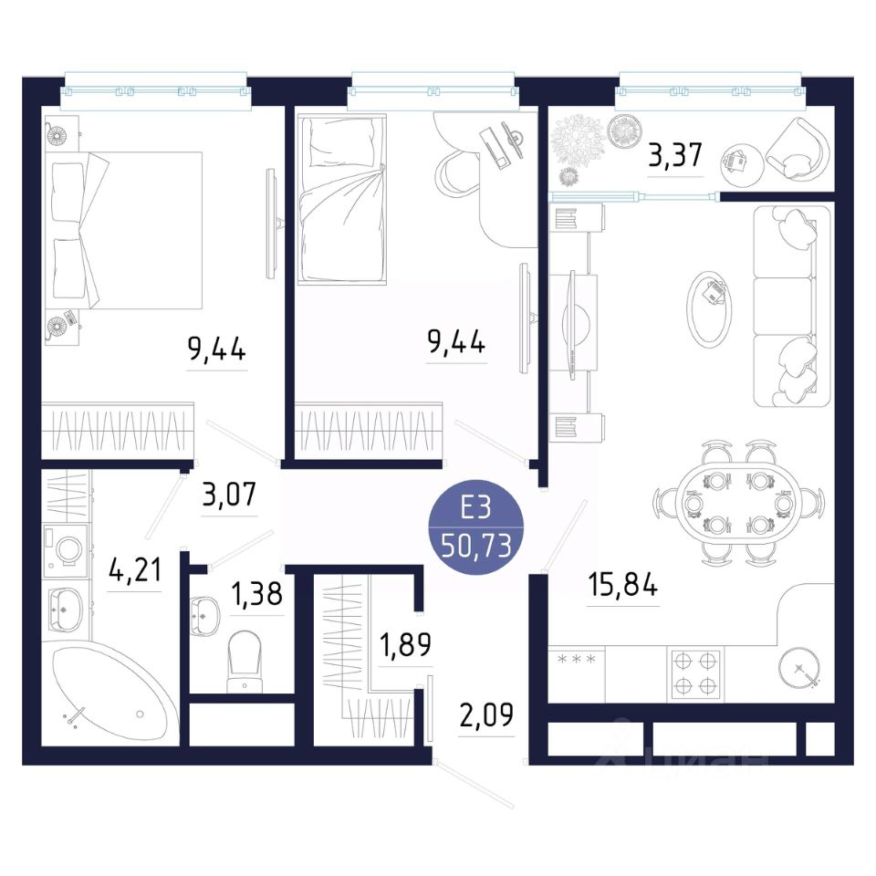 Общая площадь50,73 м²