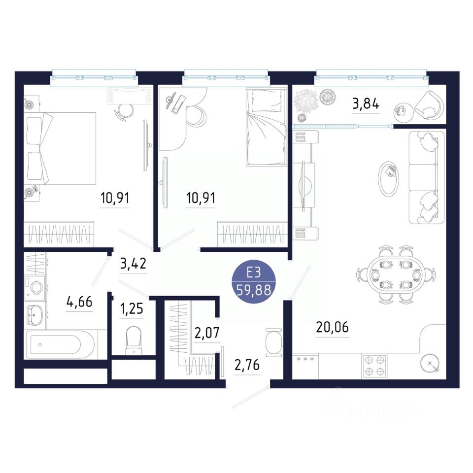Общая площадь59,88 м²