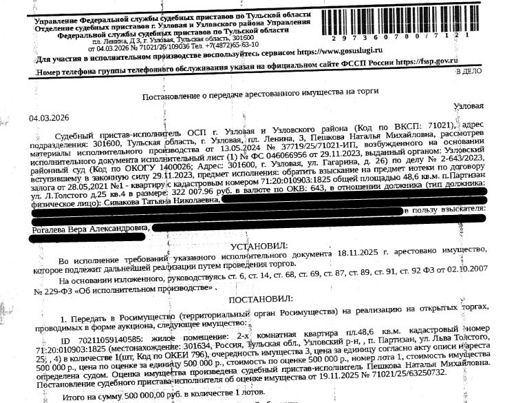 Помещение, назначение: жилое, наименование: квартира, площадь 48,6 кв.м., кадастровый номер 71:20:010903:1825, местоположение: Тульская область, р-н Узловский, п Партизан, ул Льва Толстого, д 25, кв 4. Согласно выписке ЕГРН от 10.04.2026 г. принято заявление о невозможности государственной регистрации перехода, прекращения, ограничения права и обременения на объект недвижимости без личного участия правообладателя или его законного представителя. Сведениями о зарегистрированных по данному адресу лицах, а также о задолженности по взносам на капитальный ремонт Организатор торгов не располагает. Залогодержатель: Рогалева В.А. Начальная цена: 500 000 (Пятьсот тысяч) руб. 00 коп., без НДС. Задаток: 20 000 (Двадцать тысяч) руб. 00 коп. Шаг аукциона 1%: 5 000 (Пять тысяч) руб. 00 коп.