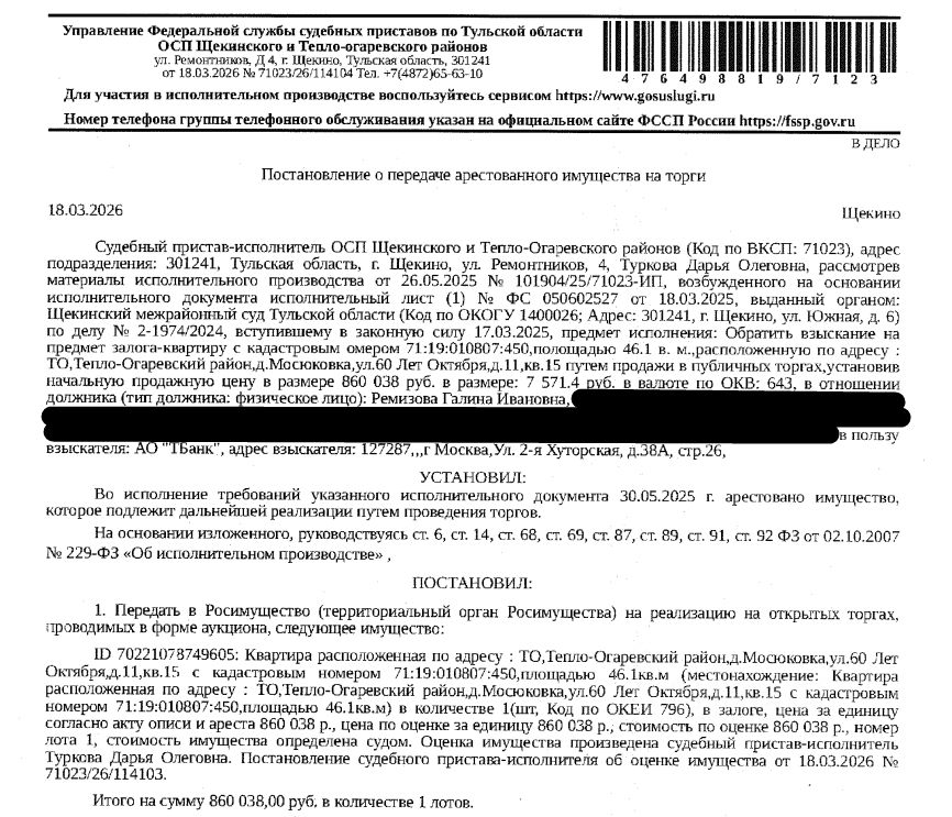 Помещение, назначение: жилое, наименование: квартира, площадь 46,1 кв.м., кадастровый номер 71:19:010807:450, местоположение: Тульская область, р-н. Тепло-Огаревский, д. Мосюковка, ул. 60 лет Октября, д. 11, кв. 15. Сведениями о зарегистрированных по данному адресу лицах, а также о задолженности по взносам на капитальный ремонт Организатор торгов не располагает. Залогодержатель: АО "Тинькофф Банк". Начальная цена: 860 038 (Восемьсот шестьдесят тысяч тридцать восемь) руб. 00 коп., без НДС. Задаток: 40 000 (Сорок тысяч) руб. 00 коп. Шаг аукциона 1%: 8 600 (Восемь тысяч шестьсот) руб. 38 коп.