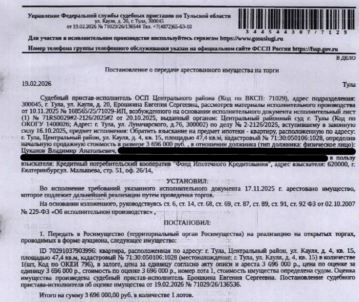 Помещение, назначение: жилое, наименование: квартира, площадь 47,4 кв.м., кадастровый номер 71:30:050106:1028, адрес: Тульская область, г Тула, р-н Центральный, ул Кауля, д 4, кв 15. Сведениями о зарегистрированных по данному адресу лицах, а также о задолж-ти по взносам на кап.ремонт Организатор торгов не располагает. Взыскатель, в пользу которого обращено взыскание - КПК "Фонд Ипотечного Кредитования". Согласно выписке ЕГРН имеются сведения о залоге имущества в пользу ООО Профессиональная коллекторская организация "Кредит Клаб Консалт". Реализация имущества должника не лишает права залогодержателя на обращение взыскания на предмет залога. Информация об остатке задолженности на момент публикации информационного сообщения у Организатора торгов отсутствует. Начальная цена: 3 696 000 (Три миллиона шестьсот девяносто шесть тысяч) руб. 00 коп., без НДС. Задаток: 180 000 (Сто восемьдесят тысяч) руб. 00 коп. Шаг аукциона 1%: 36 960 (Тридцать шесть тысяч девятьсот шестьдесят) руб. 00 коп.