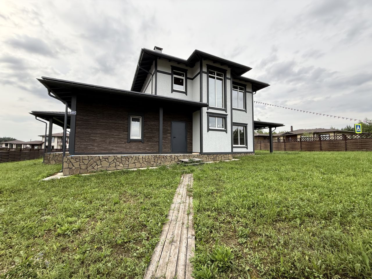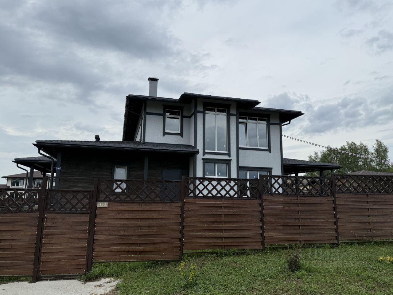 Дом 451 в Коттеджном поселке Капитанская Бухта. Дом построен на крепком бетонном фундаменте, стены: 1 этаж ж/б панели, 2 этаж - пеноблок (300 мм), межэтажные перекрытия - ж/б плита. Окна и балконные двери ПВХ 2-х камерные, профиль 70, кровля - мягкая черепица Shinglas. Выполнена фасадная отделка дома с наружным утеплением, штукатуркой и покраской стен и устройством декоративных элементов (русты, наличники, декоративные рамки), выполнены отмостка вокруг дома, отделка цоколя натуральным камнем, по краям кровли установлена водосточная система. К дому подведены все центральные коммуникации (газ, электричество, водоснабжение, центральный канализационный коллектор). Дом построен по проекту "Арктика 3" (см. фото поэтажных планов). Планировка этого проекта включает в себя 5 спален, 3 санузла, просторную кухню-гостиную с выходом на огромную крытую террасу, удобные места хранения (гардеробные) и подсобные помещения (котельная и холл). Пристроен навес для автомобиля. Дом находится в застроенной части поселка Капитанская Бухта