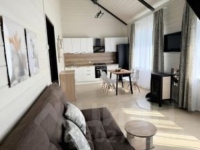 В кухне-гостиной в помощь электрическому отоплению от эконом. панелей Silinom, установлена печь-камин на дровах Бавария Эко, способная автономно отапливать до 150 м3 помещения. Стоимость отопления коттеджа зимой при постоянном проживании до 6 тыс. рублей.