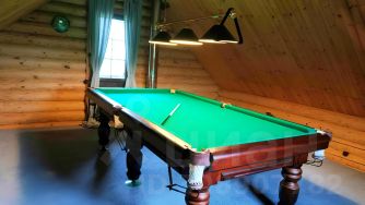 Отдельно стоящая Баня 2 этажа, на первом - комната отдыха, туалет, парная - печь Харвиа на дровах, душевая с теплым полом, на втором - бильярд американский пул 9 футов.