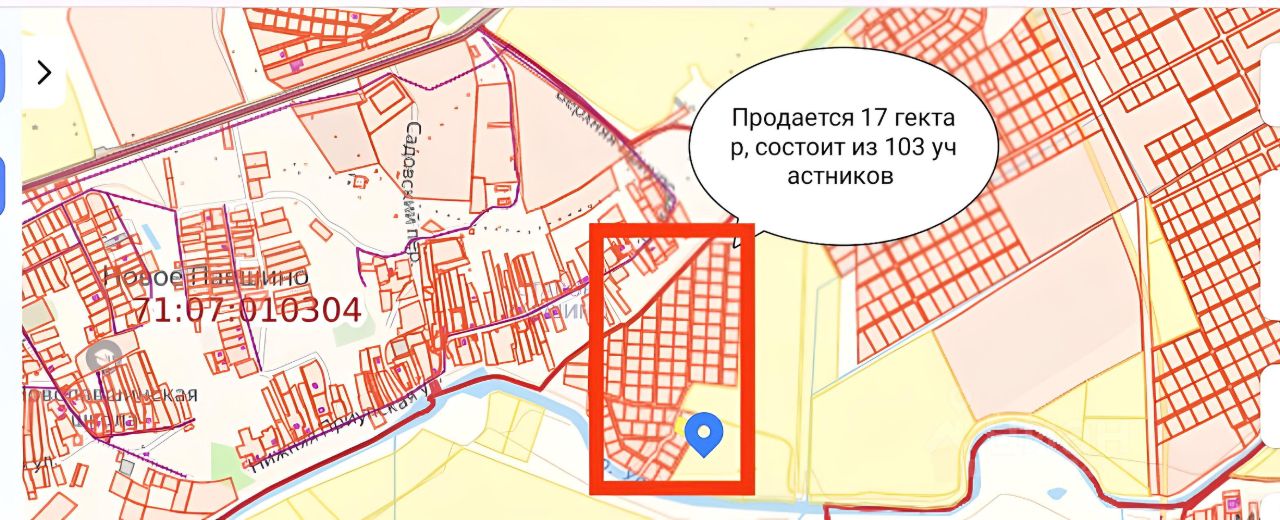 Продается 17 гектар земли, провели межевание, разделили на 103 участка, разрешённое использование: для сельскохозяйственного использования, для сельскохозяйственного производства, категория земель: земли населенных пунктов, находящийся по адресу: Тульская область, Дубенский район, с. Новое Павшино, ул. Садовая.