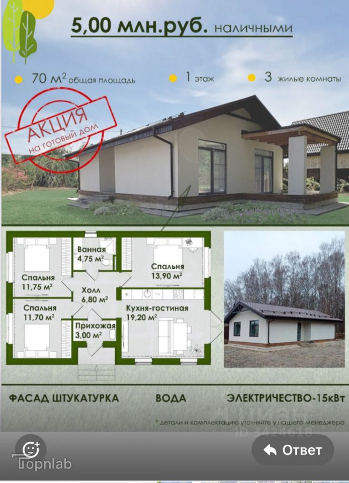Арт. 111923038 ПРОДАЕТСЯ ГОТОВЫЙ ДОМ 70 КВ М. на участке 6 сот. В СНТ "Березовая роща" (рядом п. Рассвет) ФАСАД белая штукатурка, ВОДА В ДОМЕ. С межкомнатными перегородками, две комнаты, можно сделать три. Стены отштукатурены.
