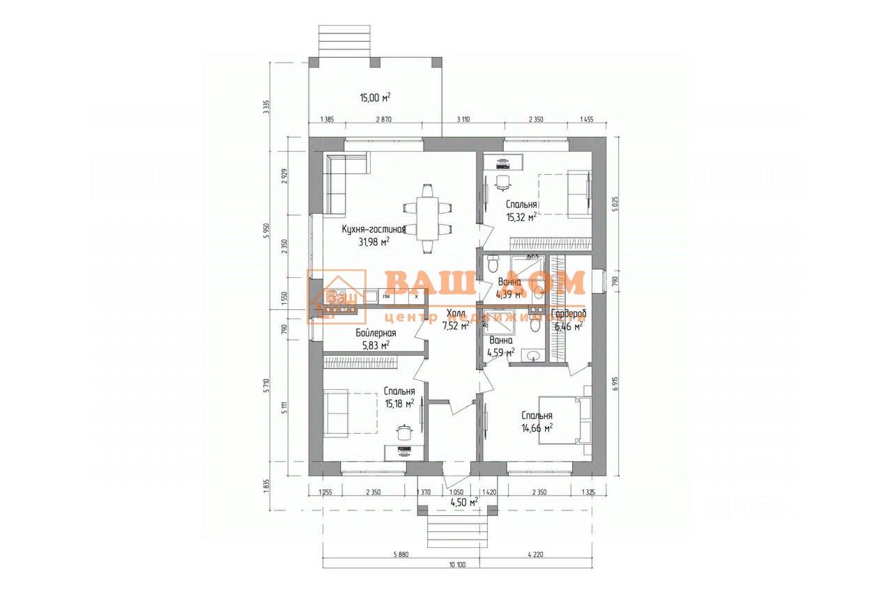 Арт. 111922601 В продажу предлагается одноэтажный дом комфорт класса на подрядное строительство с собственным участком. Уникальная возможность жить на природе и пользоваться всеми благами цивилизации. Удобный подъезд и транспортная доступность. Что касается проекта, то внутри дома жильцов ожидает настоящий уют, благодаря грамотному и функциональному разделению дома на зоны. С одной стороны дома расположена большая кухня-гостиная. Добавлено витражное остекление гостиной с выходом на открытую террасу для отдыха на свежем воздухе. Именно благодаря витражному остеклению в доме достаточно много естественного света. Просторный холл, санузл и гардеробная для хранения вещей. Дом 100 кв. м с открытым выходом на террасу из гостиной с собственным участком 8,4 сотки дарует простор для фантазии владельца и ландшафтного дизайнера. Все коммуникации свет, вода, газ по границе участка. Закладные для коммуникации включены в проект. Современные отделочные материалы. Энергоэффективная технология строительства. Оптимальная площадь и конфигурация. Нет проходных комнат. Фундамент свайно-ростверковый с применением арматуры 12-го диаметра. Монолитная армированная плита с покрытием по обратной засыпке толщиной 150мм. Фасады из керамического кирпича, стены из газобетона и вентзазора. Утепление потолка базальтовой ватой, подшивка обрезной доской. Пластиковые, двухкамерные окна. Установка утепленной металлической двери. Возможна отделка WHITE BOX (предчистовая отделка): выравнивание стен гипсовой механизированной штукатуркой под маяк, стяжка пола механизированная 50-70мм , штукатурка санузлов. теплый пол, выводами под радиаторы, разводка электрики по ГОСТ, разводка сантехники (выводы воды, канализации), установка 2х контурного котла к стоимости 5000 руб. за кв.м
