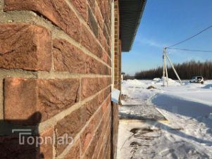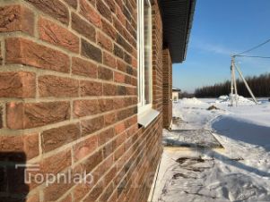 Стены - газобетон 400 мм, вентилируемый зазор, облицовочный кирпич ручной формовки;