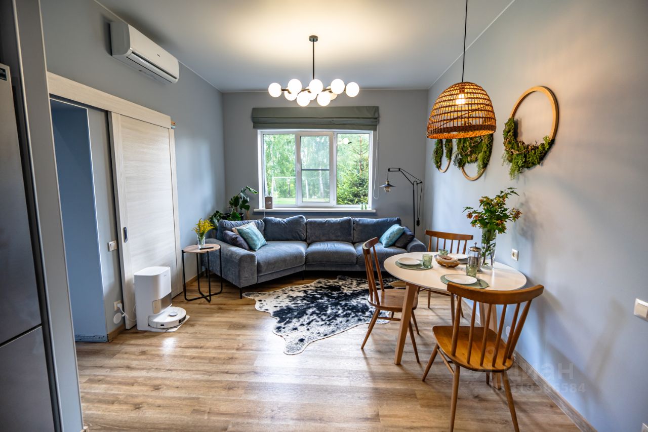 -кухня-гостиная с большим диваном и обеденным столом. Кухонный гарнитур выполнен в современном дизайне, духовой шкаф Bosch, плита Hotpoint, холодильник Samsung, вытяжка Maunfeld. Установлен кондиционер.