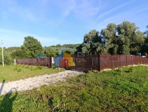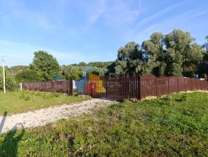 Вокруг участка красивый забор из металлического штакетника. Соседи только с одной стороны. С других сторон высажены сосны в несколько рядов, кедры, вишни. Имеется свой съезд с дороги, отсыпанный щебнем.